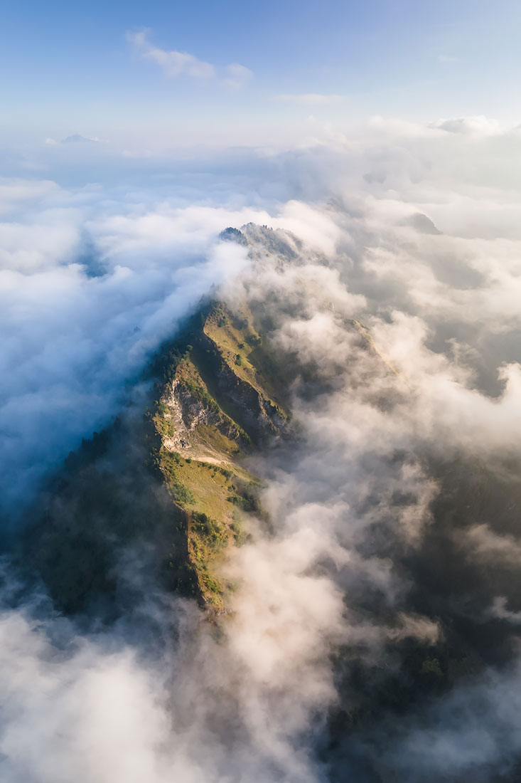 La Belle Etoile vue du ciel. Au petit matin, la brume, en provenance de Haute-Savoie, a envahi les Bauges. Le chaînon de la Belle Etoile et de la Dent de Cons s’entremêle avec les nuages. Seules quelques crêtes émergent, baignant dans le soleil de l’aube. Cette scène fantastique a pu être immortalisée grâce au drone. Il permet de prendre de la hauteur sur les lieux et d’obtenir une vue d’ensemble.