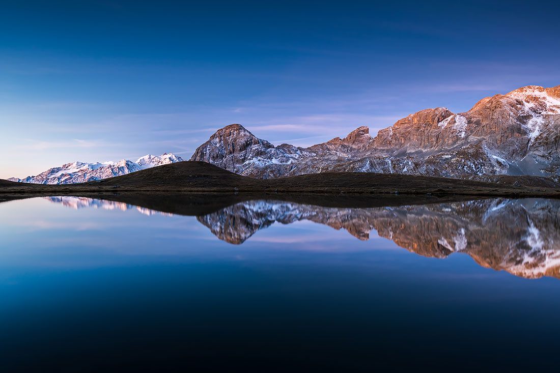 A l’aube, les premières lueurs illuminent les sommets surplombant le lac de la Ponsonnière. L’heure bleue sublime les paysages. Au loin, les Ecrins se distinguent par leur blancheur, dominés par la montagne des Agneaux. Plus proches, se succèdent Roche Colombe, le pic de la Ponsonnière et la Tête de Colombe. Ils se reflètent dans les eaux calmes du lac de la Ponsonnière.