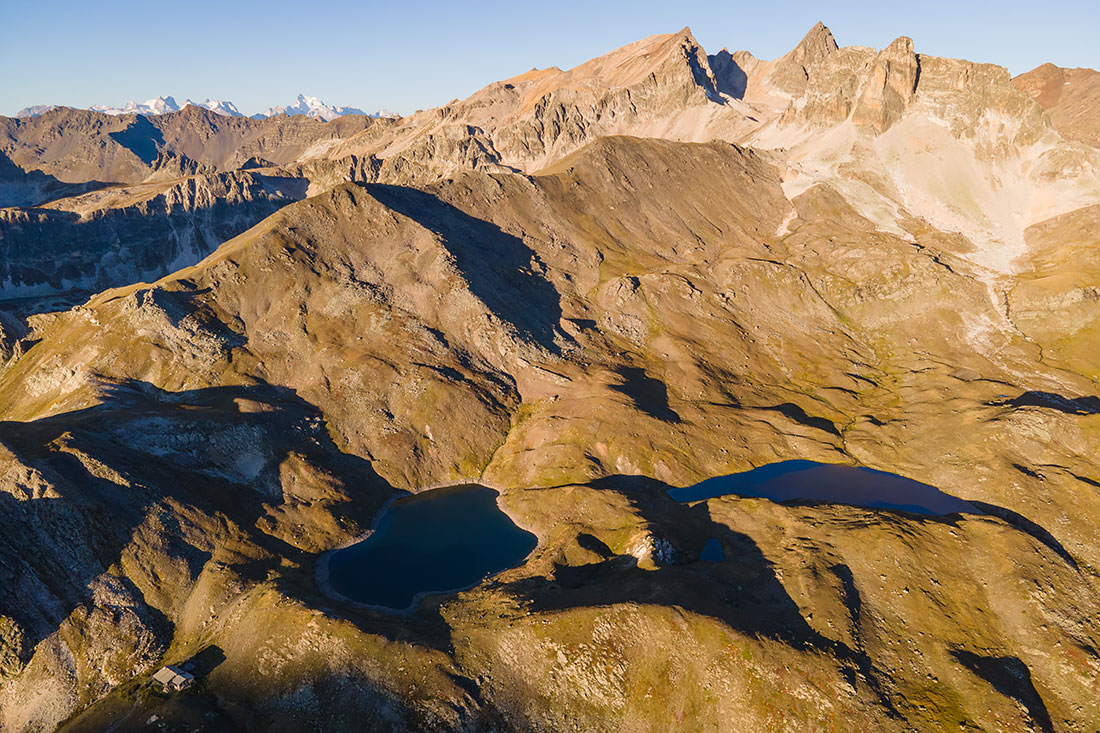 Le soleil matinal inonde de sa lumière les lacs Sainte-Marguerite, à quelques encablures du refuge du Mont Thabor. Ce point de vue unique offre un panorama d’exception sur cette partie des Cerces, ici dominée par le Mont Thabor. Au loin, émergent discrètement les sommets des Ecrins.